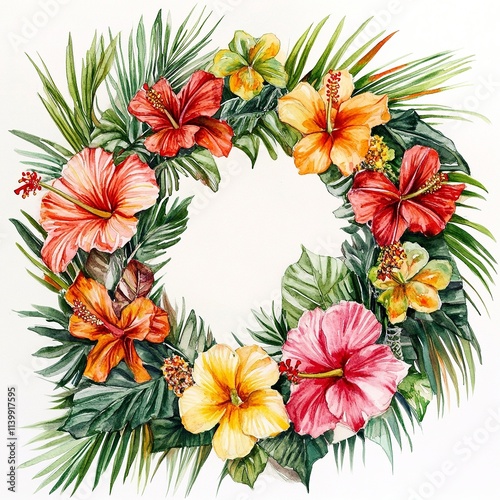 Watercolor painting of a tropical floral wreath featuring hibiscus, orchids, and small anthuriums
