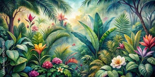 Watercolor Painting of Lush Tropical Jungle with Bright Flowers, Tropical Jungle, Watercolor Painting