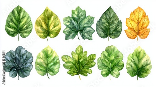 watercolor, painting, leaf, green, yellow, foliage, plant, nature, botanical, illustration, art, artwork, design, element, graphic, image, picture, visual, vibrant, bright, colourful, autumn, summer, spring, organic, natural, texture, detail, shape, form, colours, hue, shade, tone, palette, variety, collection, set, assortment, pattern, background, white, isolated