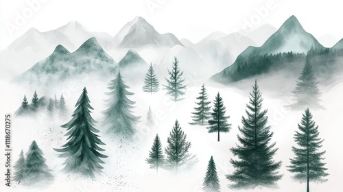 watercolor, pine, tree, mountain, landscape, christmas, abstract, fir, painting, element, ecology, artistic, design, mist, green, forest, horizon, card, dusk, hiking, spruce, fog, smoky, graphic, evergreen, drawing, art, wallpaper, travel, poster, timberland, coniferous, tree, silhouette, isolated, clip art, hill, background, texture, panorama, nature, illustration, decoration, border, environment, scenery, landscape, wild