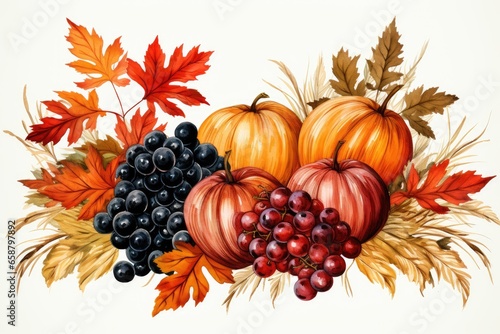 Watercolor pumpkins, red grapes, autumn leaves and grass on a white background. Thanksgiving Day