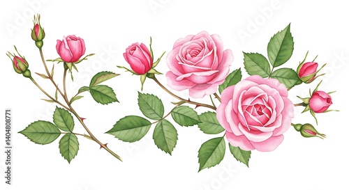 rose, pink, bud, bloom, flower, flower petals, leaf, stem, thorn, botanical, illustration, watercolor, painting, floral, arrangement, design, element, nature, romantic, delicate, elegant, pretty, artwork, greenery