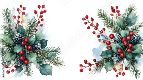 Watercolor round christmas frame with fir branches berry leaves plant herb winter flora isolated on white background. Botanical greenery holiday illustration for wedding invitation card design