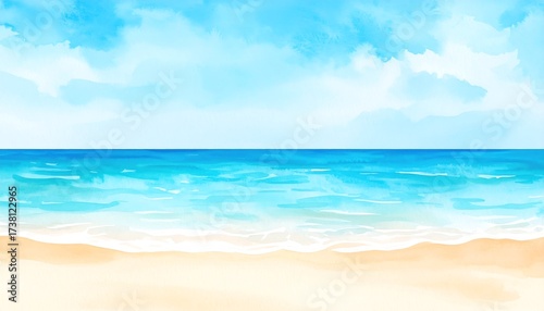 sky, beach, ocean, wave, water, blue, sand, sun, cloud, pastel, summer, horizon, light, peaceful, nature, landscape, watercolor, vibrant, tranquil, bright, colours, art, painting, pretty, calm