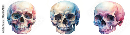 Watercolor skull illustrations, artistic anatomy studies, colorful skull designs, educational art pieces, unique wall decor.