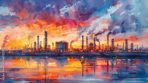 watercolor, industrial, sunset, painting, smokestack, landscape, art, water, colours, bright, factory, industry, artistic, environment, pollution, sky, cloud, orange, red, purple, evening, twilight, water reflection, paint, smokestack, colorful sky, watercolor, nature, environmental, night, city, city landscape
