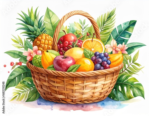 Watercolor Tropical Fruit Basket Surrounded by Lush Foliage: A Whimsical Delight