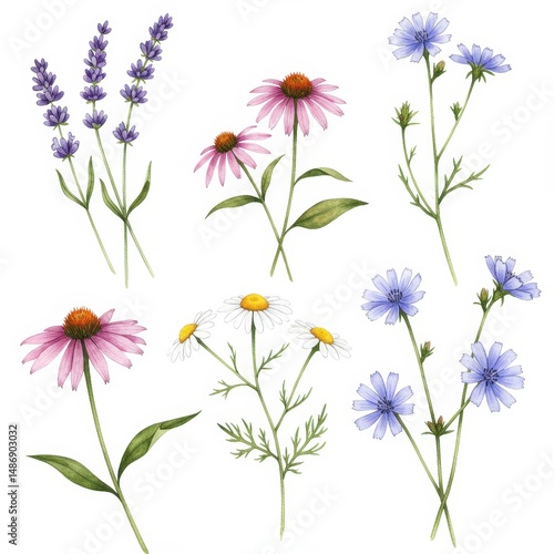 wildflower, herb, watercolor, botanical, illustration, set, lavandula, echinacea, chamomile, chicory, flower, plant, purple, pink, white, blue, green, stem, leaf, bloom, blossom, natural, nature, floral, delicate, garden, spring, summer, background, design, element, graphic, decoration, beauty, health, organic, medicine, spa