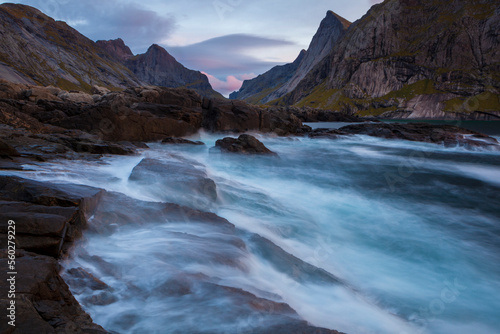 Waves crash onto the rocks at Horseid Beach, Moskenesoya, Lofoten Islands, Norway.