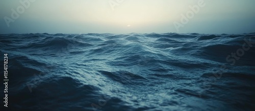 Waves on the ocean surface stirred by wind under a cloudy sky at dusk creating a dramatic seascape atmosphere.