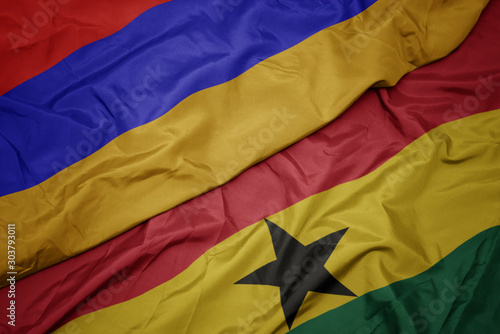 waving colorful flag of ghana and national flag of armenia.