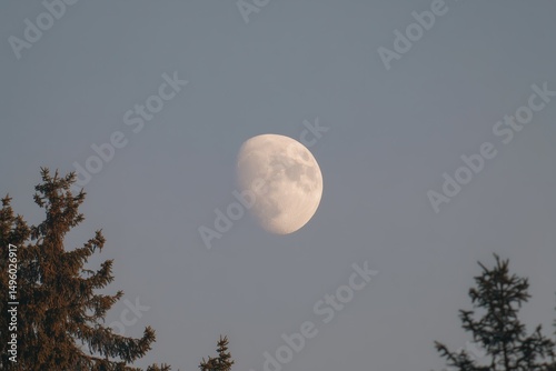 Waxing Gibbous Moon in a Pale Sky Framed by Evergreen Trees