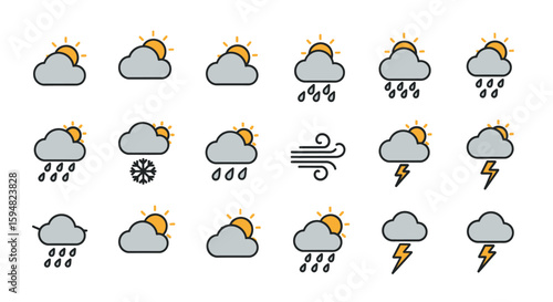weather, icon, icon, set, sunny, sun, cloud, cloud, cloudy, rain, rainy, snow, snowy, wind, windy, storm, stormy, forecast, climate, meteorology, temperature, season, day, night, illustration, design, graphic, symbol, element, isolated, vector, art, background, sky, nature, environment, weather forecast