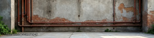 Weathered concrete foundation with worn brick patterns and rusty metal pipes, metal, brick
