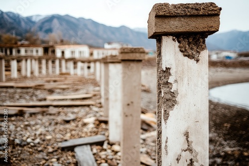 Weathered concrete pillars decaying structure mountain background