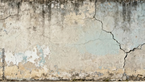 Weathered concrete surface exhibits extensive cracking and peeling paint coloration