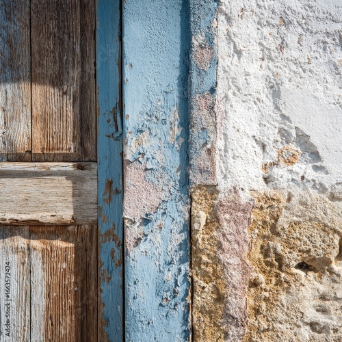 weathered, door, wood, wall, stone, metal, blue, painted, cracked, rustic, old, aged, sunlight, light, shadow, texture, detail, detail, architecture, building, exterior, fragment, closeup, vintage, decay, flaking, imperfect, rough, natural, pattern, grey, beige, brown, tan, white, horizontal, vertical, structure, surface, contrast, daylight, exposed