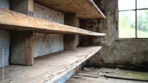 Weathered Wooden Shelf in Decrepit Space with Natural Light Streaming Through Window