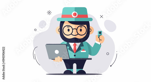 cartoon, person, man, character, illustration, flat, design, digital, technology, computer, laptop, device, contraption, holding, datum, cyberspace, online, business, work, professional, connected, communication, information, cognition, education, learning, smart, modern, stylish, hat, goggles, beard, attaching, suit, formal, creative, concept, graphic, vector, icon, symbol, web, app, software, office, manager