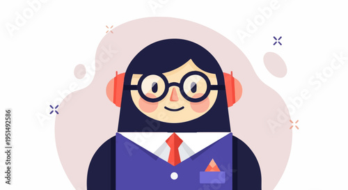 character, animated, cartoon, illustration, happy, cheerful, smiling, goggles, round, black, hair, dark, long, earphones, red, outfit, suit, blue, attaching, shirt, white, pocket, square, orange, accent, pink, background, abstract, shape, dot, x, cute, simple, flat, design, graphic, icon, avatar, profile, person, individual, smart, professional, stylish, modern, creative, whimsical, friendly
