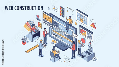 web, construction, team, collaboration, digital, project, design, development, coding, programming, cyberspace, online, business, technology, computer, screen, monitor, people, men at work, office, workspace, planning, strategy, analysis, datum, chart, graph, interface, user, life events, application, software, network, server, cloud, startup, innovation, creativity, idea, meeting, discussion, task, management, workflow, process, isometric, illustration