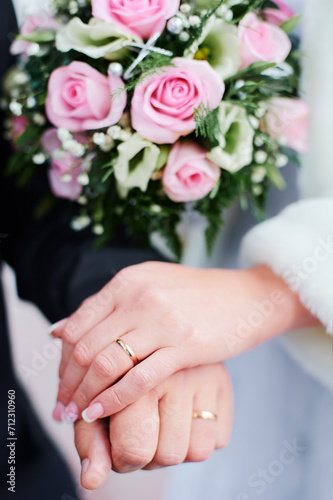 Wedding concept. Close-up of bridal and groom hands with a golden rings on it.