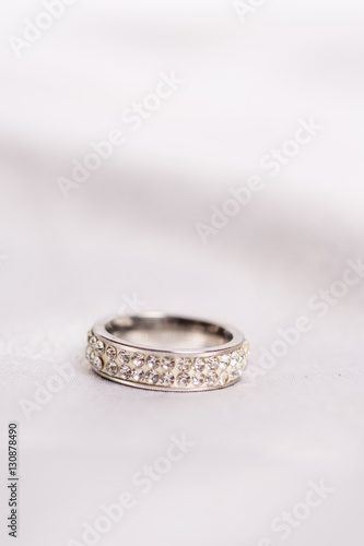 Wedding diamond ring on white satin background