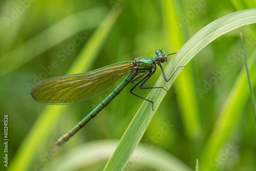 weibliche Prachtlibelle auf einem Grashalm