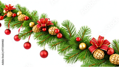 Weihnachtsgirlande mit roten und goldenen Kugeln und Schleife isoliert auf weißem Hintergrund