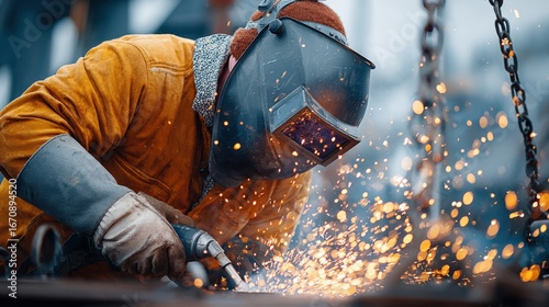 Welder at Work: Professional Craftsman Welding Metal with Sparks, Safety Gear, Precision and Skill