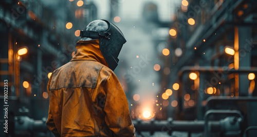 Welder in a protective suit against the background of a metallurgical plant, Portrait, Rear view. Generative AI.