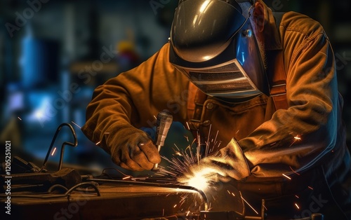 welder, welding, metal, work, men at work, working man, construction, industry, factory, manufacturing, safety, protective, gear, equipment, spark, fire, heat, light, glove, mask, helmet, hard, hat, tool, machinery, industrial, job, craft, skill, art, craftsman, professional, labor, manual, workwear, apparel, steel, iron, workshop, fabrication, engineering, design, project, repair, build, maintenance, dark, gritty, concentrated