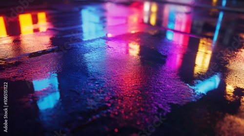 Wet asphalt reflecting neon colors in the night
