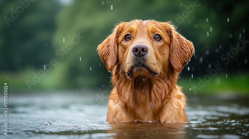 Wet golden retriever dog staring directly into the camera, close-up portrait, playful expression, water droplets, outdoor pet, adorable animal, loyal companion, golden fur, cute moment.
