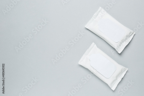 Wet wipes flow packs on light grey background, flat lay. Space for text