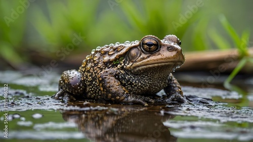 Wetland Serenity: Common Toad Resting on Log Amid Raindrops