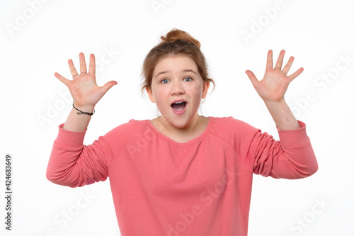 amazement, wonder, awe, lass, miracle, mouth, optimistic, teenage, sentiment, smile, joyful, excited, positive, teenage, expression, minor, feeling, teenage, face, schoolgirl, emotion, gesture, girl, pretty, children, 1, portrait, standing, studio, lovely, caucasian, adorable, cute, lifestyle, little, casual attire, pink, happy, shocked, surprise, screaming