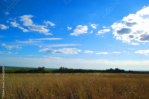 Wheat field against a blue sky with white clouds on a Sunny day in summer