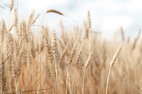 Wheat field. Ears of golden wheat close up. Rural Scenery under Shining Sunlight.