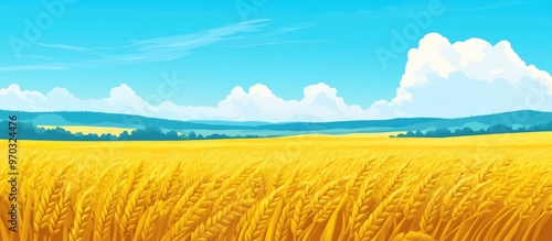 wheat, field, blue, sky, summer, landscape, yellow, ripe, crop, agricultural, harvest, flat, illustration, nature, growth, grain, farming, rural, farm, harvest, cultivation, fertility, season, sunny, plant, stalk, vibrant, environment, bright, ecology, scenery, texture, colours, organic, natural, horizon, sunshine, picturesque, agriculture, countryside, seasonal, serene