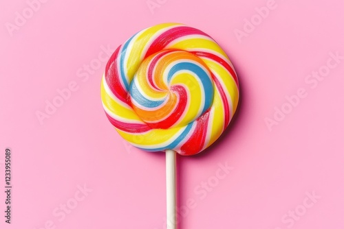 Whimsical candy swirl lollipop on a bright pink background colorful dessert photography playful environment close-up viewpoint concept of joy and sweetness