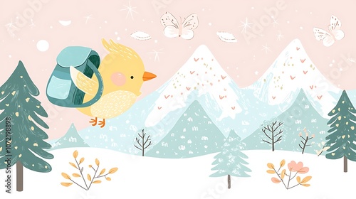 baby, bird, whimsical, cartoon, scene, mountain, tree, snow, butterfly, pastel, nature, adventure, flight, outdoors, forest, landscape, winter, cute, cheerful, joyful, delightful, serene, colourful, art, illustration, design, sky, fauna, flora, wildlife, happiness, freedom, environment, promotion, travel, whimsy, character, animation, story, imagery