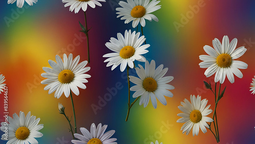 Whimsical daisies bloom against a rainbow gradient backdrop, creating a vibrant and enchanting scene filled with joy and color