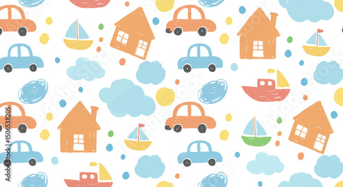 Whimsical Kids Pattern: Cars, Houses, Boats, and Clouds