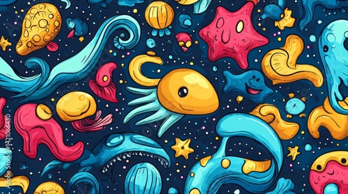 Whimsical undersea pattern showcases stylized cartoon sea creatures