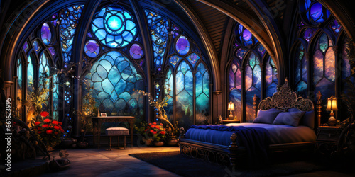 Whimsigothic style bedroom interior design with blue stained glass windows, dark, wide