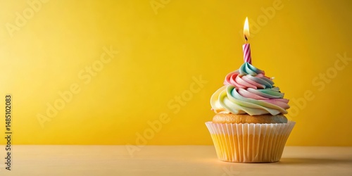 Whipped cream topping on a brightly colored cupcake with a single candle lit in the center, sitting atop a soft pastel yellow background , birthday cake, celebration