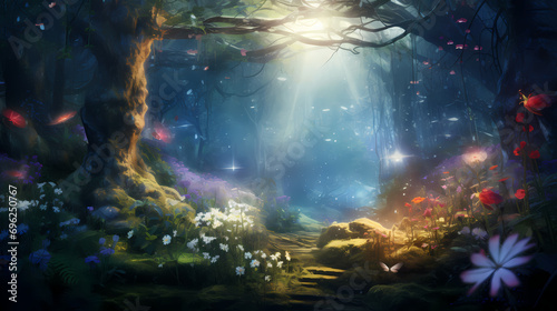 enchanted forest, mystical, aethereal, fantasy, digital, fairy tale, magical, whimsical, nature, ambient, dreamlike, surreal, high-coloured, aglow, captivating, storybook, enchantment, mythical, serene, imaginative, wonderland