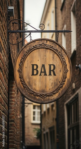 wooden, signs, bar, pub, round, hanging, circular, rustic, vintage, old, aged, brown, dark, alleyway, brick, wall, exterior, doorway, entrance, metal, chain, ornate, carved, detail, text, lettering, font, background, street, building
