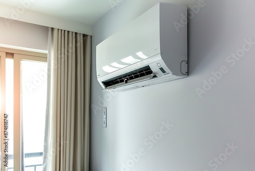 air, conditioner, unit, wall, mounted, room, window, curtain, beige, white, indoor, cooling, system, home, appliance, ventilation, climate, control, comfort, temperature, summer, heat, fresh, clean, energy, efficiency, modern, interior, design, residential, house, apartment, building, functional, technology, living, space